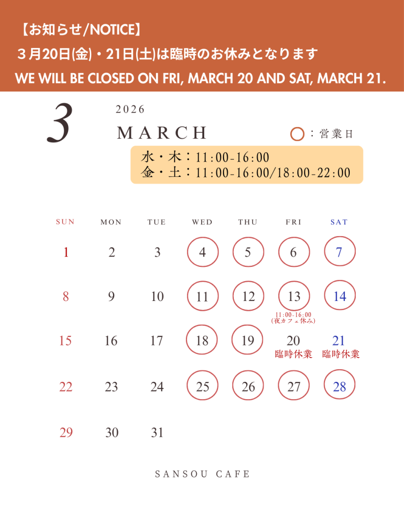 At SANSOU CAFE, we focus on simple, nourishing meals made from seasonal ingredients and carefully selected seasonings. We prepare our dishes with minimal additives, and our signature enzyme brown rice is slow-cooked for enhanced flavor, digestibility, and nutritional value. We aim to provide food that helps your body and mind feel naturally balanced.